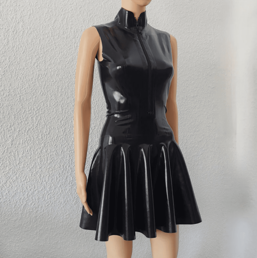 This latex dress features a princess cut top with a front zip and a skater skirt attached to it. Handmade with 0.4mm natural latex.