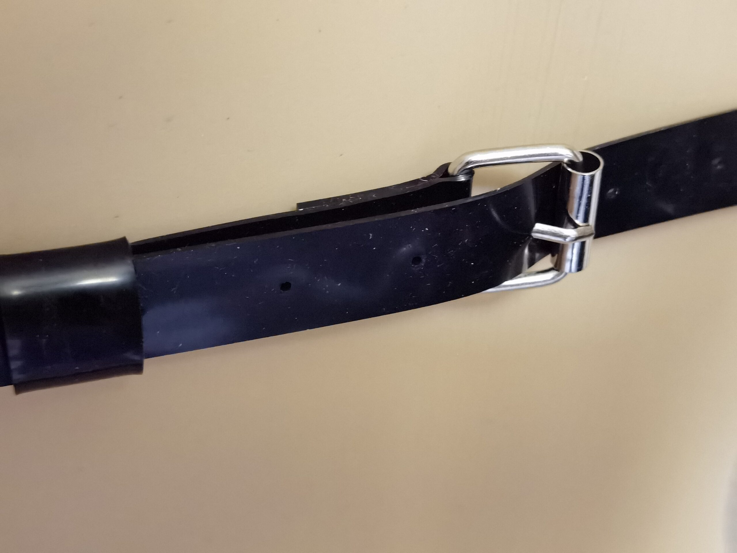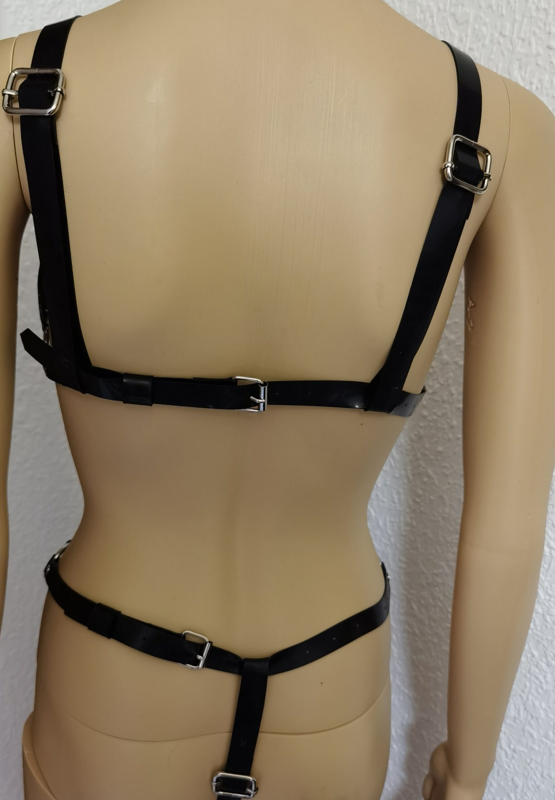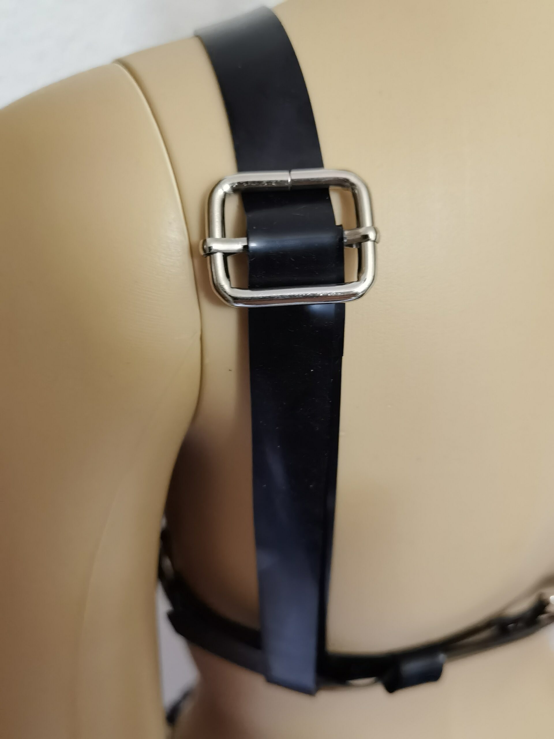 Latex body harness, made with 1.2mm natural latex. Rings and other metalware are stainless steel, rivets are brass. One-size, adjustable.