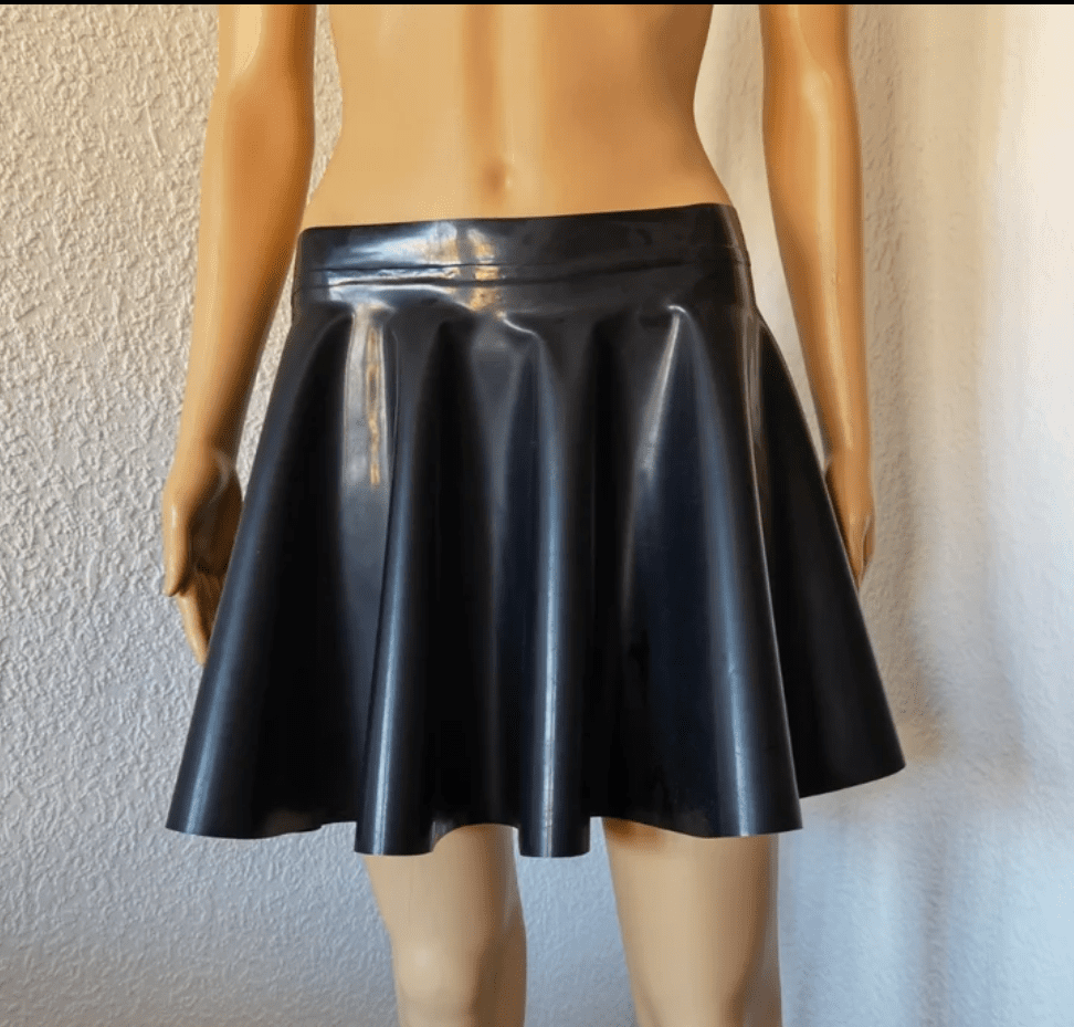 Basic latex skater skirt, with a length of 35cm (above knee) and a thick, comfortable waistband. The skirt is made of high quality 0.4mm natural latex and the waistband is 0.8mm, keeping the skirt in place.